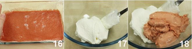 Vierte la crema obtenida en un bol ancho y bajo que cubrirás con film transparente que colocarás sobre la crema: pon en el frigorífico a enfriar 16. Si la crema, una vez fuera del frigorífico, está demasiado sólida, pásala por las cuchillas de una batidora y volverá a estar lisa y suave. Monta la nata 17 y añádela a la crema de fresas 18: si hubiera grumos, pasa todo por un tamiz (no temas, la crema quedará ligera, densa y consistente) presionando hacia abajo con una espátula de silicona.