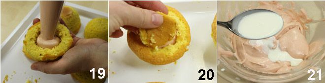 Prepara el almíbar para empapar las delicias disolviendo el azúcar con el agua al fuego y añadiendo a este jarabe la esencia o el licor elegido; deja que el almíbar se enfríe. Excava las delicias en el centro, empápalas ligeramente con el almíbar y rellena las cavidades con la crema de fresas 18, luego tapa el agujero con una rodaja de bizcocho 20 tomada de la base del tapón retirado de cada una de ellas y colócalas sobre una rejilla. Alarga la crema restante con unas cucharadas de nata líquida o con leche 21