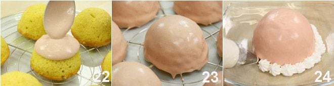 y cubre las esferas 22 dejando que el exceso de crema escurra 23. A este punto decora la delicia de fresa con unos rosetones de nata montada 24 y con fresas silvestres a gusto. Pon las delicias de fresa en el frigorífico hasta el momento de servirlas.
