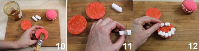 Cuando estén bien fríos, pinta generosamente la parte plana de los discos con la mermelada de albaricoque 10. Luego corta los malvaviscos en cilindros de 1 cm de grosor de los cuales, con un cuchillo, obtendrás cuadraditos: habrás obtenido los dientes para las dentaduras 11. Coloca los dientes de malvavisco a lo largo del perímetro de 8 discos (puedes cubrir todo el perímetro o solo la mitad, como en la foto, poniendo solo dos cubitos en la parte trasera como soporte) 12, luego cierra a modo de sándwich con los discos restantes y deja secar todo. ¡Tus dentaduras están listas, feliz Halloween!!!