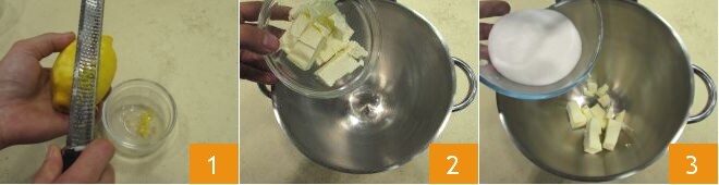 Para preparar los diamantitos, ralla la cáscara de 1 limón no tratado. Luego en el bol de una batidora planetaria, pon la mantequilla fría de la nevera en trozos 2, añade el azúcar 3