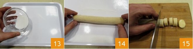 Una vez listos, sácalos del frigorífico, prepara dos bandejas. En una distribuye el azúcar granulado 13 y haz rodar 1 o 2 de los cilindros, para que el azúcar se adhiera a la superficie 14. Luego corta los diamantitos, discos de aproximadamente 1 cm de grosor 15.