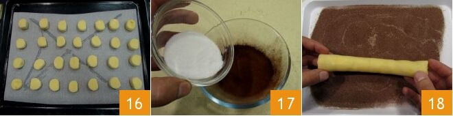 Colócalos bien separados en una bandeja engrasada y forrada con papel de horno 16 y hornea en horno estático precalentado a 180° durante unos 10-12 minutos (160° durante unos 4-6 minutos si es horno ventilado; no deben oscurecerse demasiado; también puedes hornear pocos a la vez para ajustar mejor los tiempos y la temperatura). Mientras tanto, condimenta los cilindros restantes con cacao: en un bol mezcla el cacao amargo en polvo tamizado con el azúcar granulado 17, espárcelo en una bandeja y haz rodar los cilindros de masa 18.