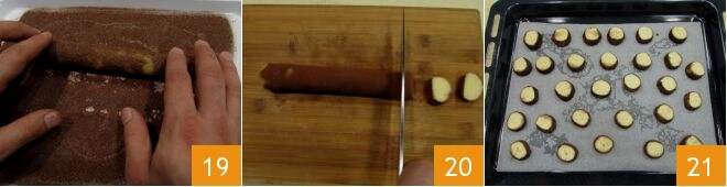 Condimenta bien toda la superficie para que el cacao y el azúcar se adhieran 19, luego corta en discos de 1 cm de grosor 20 y colócalos en una bandeja engrasada y forrada con papel de horno, bien separados 21. Hornea en horno estático precalentado a 180° durante unos 10-12 minutos (si es horno ventilado 160° durante unos 4-6 minutos; también puedes hornear pocos a la vez para ajustar mejor los tiempos y la temperatura).