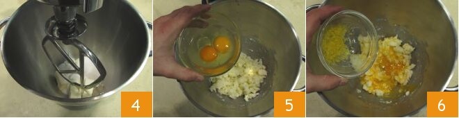 comienza a trabajar los ingredientes con la pala 4, después agrega los huevos 5 y la cáscara rallada del limón 6.