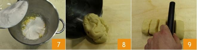 Luego añade también la harina de arroz 7 y continúa trabajando la mezcla con la batidora durante un par de minutos más. Transfiere la mezcla obtenida a una superficie de trabajo 8, forma un bloque y saca 5 piezas iguales (de unos 120 g cada una);