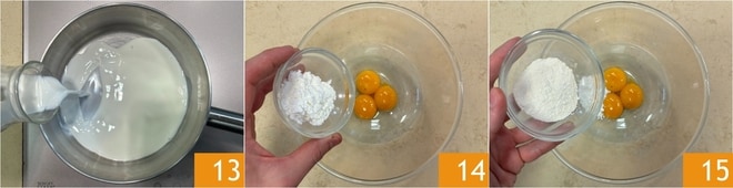 Mientras tanto, prepara la crema pastelera: vierte la leche en un cazo 13 y llévala a hervir. Mientras tanto, en un bol, coloca las yemas, el almidón de maíz 14 y la harina 15.