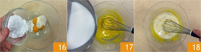 Añade también el azúcar glas 16 y mezcla bien con unas varillas, luego vierte la leche caliente 17 y mezcla nuevamente 18.