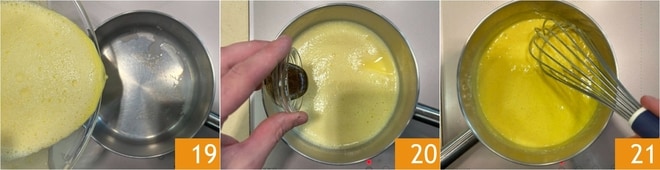 Vuelve a colocar la mezcla en el cazo 19, añade el extracto de vainilla 20 y mezcla a fuego lento hasta obtener una consistencia densa y homogénea 21.