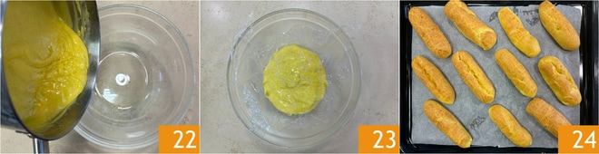 Pasa la crema a un bol 22, cubre con film en contacto 23 y coloca en el frigorífico para enfriar. Transcurrido el tiempo de cocción, retira del horno los éclairs y deja que se enfríen también 24.