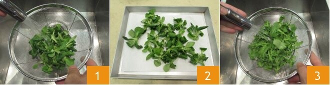 Para preparar la ensalada con fresas al balsámico, lo primero que debes hacer es lavar bajo abundante agua corriente fresca la valeriana 1, secarla delicadamente con un paño limpio 2, y luego romperla con los dedos. Procede de la misma manera con la rúcula 3,
