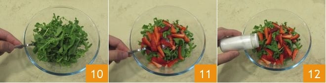 Toma una ensaladera bastante grande 10 y junta la ensalada y las fresas 11; luego añade la sal 12,