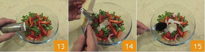 la pimienta molida 13 y el parmesano cortado finamente 14. Aliña con una cucharada de vinagre balsámico 15