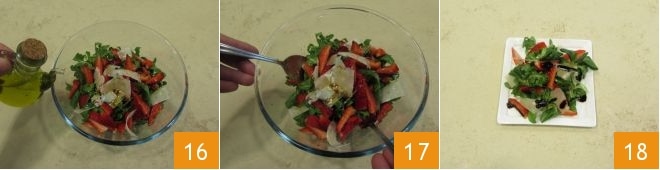 y una cucharada de aceite 16, luego mezcla todo delicadamente 17: ¡tu ensalada con fresas al balsámico está lista para ser servida 18!