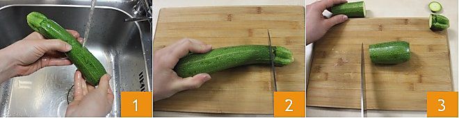 Para preparar la ensalada de calabacines con menta y albahaca, comienza lavando cuidadosamente los calabacines bajo agua corriente 1. Sécalos con un paño y colócalos sobre una tabla de cortar, luego límpialos eliminando los dos extremos 2. Después de eso, divide el calabacín por la mitad 3.