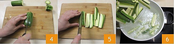 Córtalo nuevamente por la mitad en sentido longitudinal 4 y comienza a sacar rodajas de aproximadamente 1,5 cm de ancho 5. Ahora toma una olla grande, llénala de agua y lleva a ebullición. Luego, echa los calabacines cortados en el agua hirviendo 6.