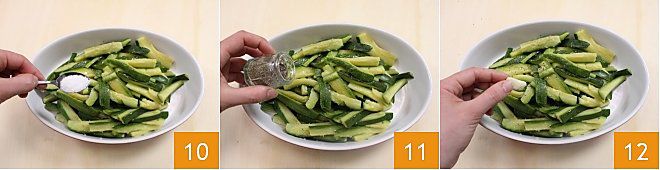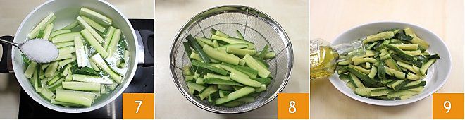 Agrega una cucharada de sal gruesa 7 y deja cocer durante 10 minutos. Transcurridos los 10 minutos, escurre los calabacines con un colador y déjalos enfriar 8. Luego transfiérelos a una fuente y condiméntalos con un chorrito de aceite de oliva virgen extra 9.