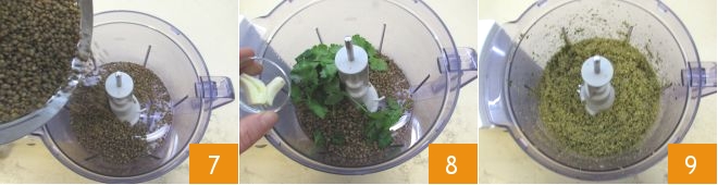 Cuando las lentejas estén bien escurridas y frías, colócalas en la batidora 7 y añade el perejil y el ajo pelado 8. Activa las cuchillas y tritura todo para obtener un paté fino 9.