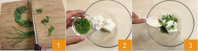 Para preparar los fagottini de speck rellenos de robiola con torcelli, comienza con la preparación de la crema de robiola: pica finamente las hierbas aromáticas (tomillo, albahaca y cebollino) 1, luego agrégalas a la robiola 2, que previamente habrás puesto en un bol grande. Mezcla para integrar todos los ingredientes 3