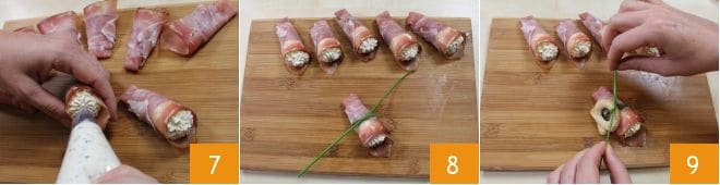 Rellena cada cono con la crema de robiola, previamente preparada 7, y asegura todo atando cada cono con un hilo de cebollino 8, al que también atarás un torcello 9. ¡Los fagottini de speck rellenos de robiola con torcelli están listos: buen provecho!