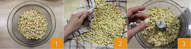 Para preparar los falafel de habas, coloca las habas en un bol con agua fría y déjalas en remojo durante una noche. Al día siguiente, escúrrelas en un colador 1 y sécalas con un paño de cocina 2. Coloca las habas en un procesador de alimentos, añade el diente de ajo 3