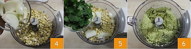 la cebolla cortada en rodajas gruesas 4 y el perejil 5, tritura las habas con los aromas hasta obtener una mezcla homogénea y bien compacta.