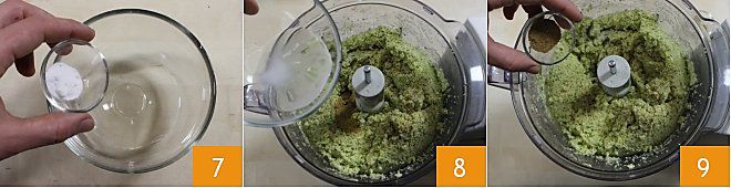 Disuelve el bicarbonato en el agua 7 y agrégalo también a la mezcla 8. Aromatiza la mezcla con la combinación de especias preparada con comino y cardamomo 9