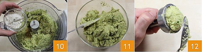 Por último, añade la harina 10 y tritura de nuevo por unos instantes. Debes obtener una mezcla no demasiado lisa, sino granulosa 11. Calienta el aceite y llévalo a la temperatura máxima de 180° (si prefieres, también puedes freír los falafel en la freidora). Se desaconseja la cocción al horno porque no teniendo empanado, los falafel corren el riesgo de secarse. Con una cucharilla toma la masa, tira hacia atrás la palanca presente en la herramienta específica para falafel (si no dispones de la herramienta, puedes formar unas pequeñas croquetas ligeramente aplastadas formando discos); llena la cavidad hasta formar una pequeña cúpula 12 presionando bien con la cucharilla (cada falafel pesa aproximadamente 30 gr)
