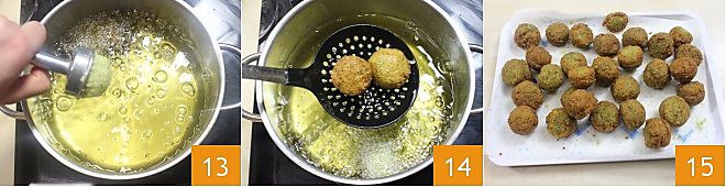Suelta la palanca y vierte el falafel directamente en el aceite caliente 13, gira los falafel de vez en cuando y retíralos cuando estén dorados 14. Escúrrelos sobre una hoja de papel absorbente 15 y sálalos ligeramente, si lo prefieres. ¡Sirve tus falafel de habas calientes!