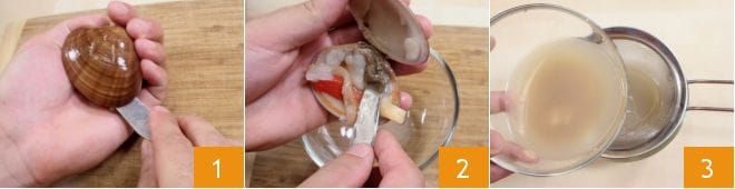 Para preparar los fasolari rellenos de hierbas, empezad extrayendo los moluscos de la concha (para limpiar los fasolari también podéis consultar la Escuela de cocina: Cómo limpiar las almejas). Insertad por unos pocos milímetros la hoja de un cuchillo entre las dos valvas 1, dejadla deslizar lateralmente teniendo cuidado de mantener la hoja inclinada hacia arriba. Forzad ligeramente el caparazón para abrirlo y cortad lateralmente el otro músculo. Antes de extraer el molusco, procurad un bol pequeño en el que deje caer el líquido de los fasolari, que utilizaréis para la cocción. Eliminad entonces la piel grisácea que recubre el fruto y la bolsa intestinal 2. Desprended el fasolari también de la parte inferior del caparazón. Reservad los caparazones y colocad los fasolari en la tabla de cortar, mientras que el líquido se deberá filtrar con un colador de malla fina y reservar; necesitaréis 100 ml 3.