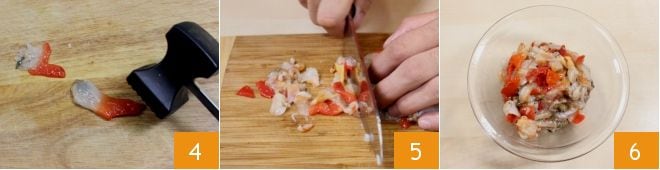 Para ablandar la carne del molusco, golpead los moluscos con un martillo o un mazo de carne insistiendo en el pie rojo que es más duro 4, luego picadlos groseramente 5 y recogedlos en un bol 6.