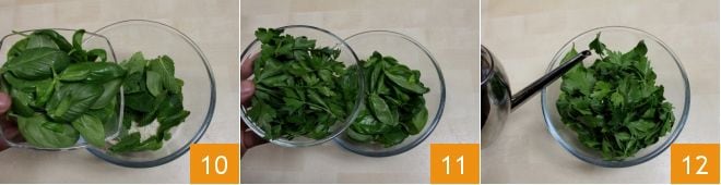Añadid las hojas de albahaca enteras 10, el perejil desmenuzado groseramente 11 y un chorrito de aceite de oliva 12.