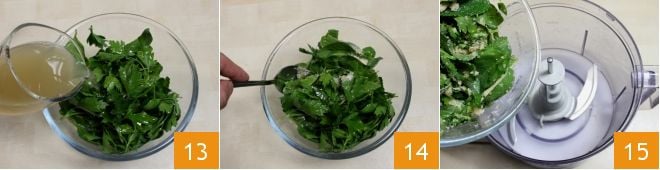 Luego verted el líquido de los fasolari que habíais reservado en el bol pequeño 13 y mezclad los ingredientes con una cucharita 14 antes de verterlos en la batidora 15 (si no tenéis batidora podéis picar finamente todas las hierbas con un cuchillo).