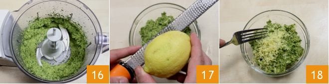Activad la batidora para obtener una crema homogénea 16. Recogedla en un bol pequeño, rallad la cáscara de limón no tratado 17 y mezcladla con la mezcla 18.