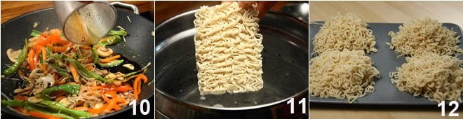 Cocina todas las verduras juntas durante unos 10 minutos a fuego lento y luego vierte en la sartén la salsa de soja y el vinagre de manzana o de arroz 10. Después prueba de sal y, si es necesario, añade más según tu gusto. Luego, deja cocinar durante un par de minutos a fuego bajo. Mientras tanto, en una cacerola, lleva a ebullición el agua con sal, una vez que haya alcanzado la ebullición, sumerge los fideos y hiérvelos por no más de 2 minutos 11, luego escúrrelos y pásalos bajo agua fría y deja que escurran bien, divídelos en 4 nidos más o menos del mismo tamaño 12 y colócalos sobre una hoja de papel absorbente.