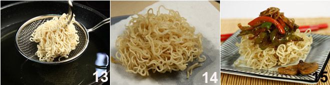 En una sartén antiadherente, calienta aceite de semillas y cuando haya alcanzado la temperatura, sumerge un nido a la vez en el aceite caliente 13. Para realizar esta operación, te recomendamos colocar cada nido sobre una espumadera y mantener la forma de los nidos ayudándote con un tenedor grande. Cuando el nido esté dorado, dale la vuelta y dora ambos lados. Continúa de la misma manera con los demás nidos y déjalos escurrir sobre papel absorbente 14. Luego, sirve un nido por persona y condiméntalo con la salsa de verduras 15.