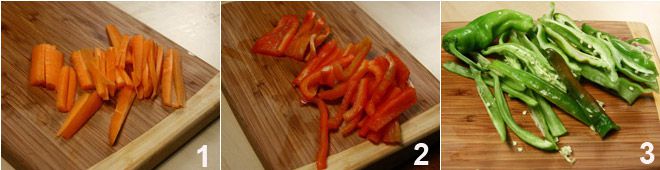 Primero, limpia la verdura y luego corta en tiras la zanahoria 1, el pimiento rojo 2 y el verde 3.
