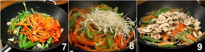 la zanahoria 7, los brotes de soja 8 y finalmente los champiñones 9. Entre la adición de un ingrediente y otro, deja transcurrir un par de minutos.
