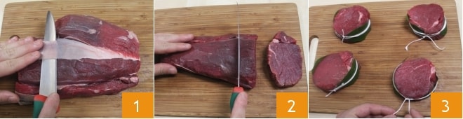 Para preparar el filete con salsa amarga empezad eliminando las partes grasas del filete 1. Luego sacad medallones de carne siguiendo las indicaciones que encontráis en la ficha Cómo realizar medallones de carne: cortad rodajas de aproximadamente 2 cm de espesor 2, de esta manera obtendréis 4 medallones. Cubrid el borde del medallón con hojas de laurel para aromatizar la carne, pasad el hilo por todo el perímetro de la rodaja de carne y fijadlo con un nudo muy apretado 3, para mantener su forma durante la cocción.
