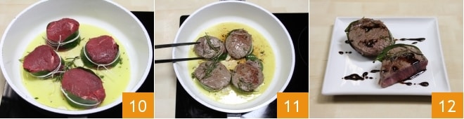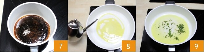 y se obtendrá una salsa concentrada y densa 7. Una vez realizada la salsa, podréis proceder con la cocción de la carne: poned al fuego una sartén grande que pueda contener los medallones, calentad una cucharada de aceite 8 con el ajo y los aromas 9.