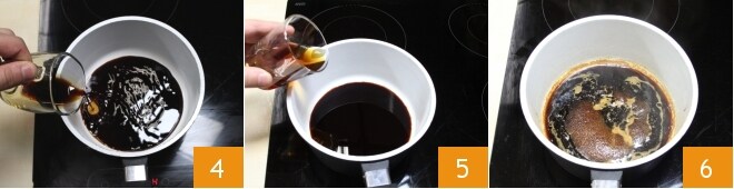 Cuando vuestros medallones estén listos, reservadlos en la nevera y ocupáos de la salsa amarga: en un cazo verted la salsa de soja 4 y añadid también el amargo aromatizado al limón 5; cocinad a fuego moderado hasta que la salsa se reduzca, de este modo se evaporará el agua presente en los líquidos 6