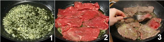 En una sartén grande calentad el aceite y la mantequilla, añadid el ajo aplastado y la chalota picada 1, dejadlos rehogar (tardarán unos 15 minutos) y luego añadid los filetes 2. Dejad que la carne se dore, primero por un lado y luego por el otro 3,