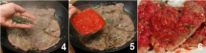 luego añadid el tomillo y la mejorana 4. Dejad que se insaporice y verted la pulpa de tomate 5. Dejad cocer todo durante 5 minutos a fuego vivo y cuando el tomate se haya reducido ajustad de sal y pimienta y luego apagad. Servid los filetes con tomate, tomillo y mejorana bien rociados con su salsa de cocción 6.