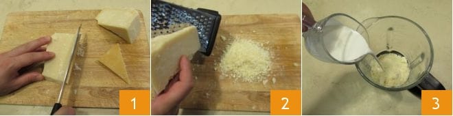 Para preparar el flan de Grana con setas rebozuelos, empieza cortando el Grana para eliminar la corteza 1. Rállalo 2 y colócalo en la jarra de una batidora. Vierte la nata 3,