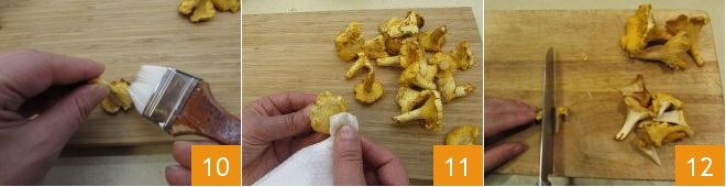 Mientras los flanes de Grana se cocinan, limpia las setas rebozuelos: cepilla delicadamente la parte inferior del sombrero para eliminar las trazas de tierra entre los pliegues 10 y límpialas con un paño suave 11. Luego córtalas por la mitad 12.