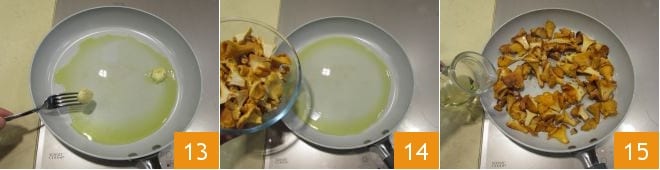 En una sartén amplia, dora un diente de ajo pelado y partido por la mitad, luego retíralo 13 y añade las setas 14. Cocínalas a fuego vivo rociándolas con vino blanco 15; cocínalas durante unos 8 minutos.