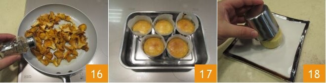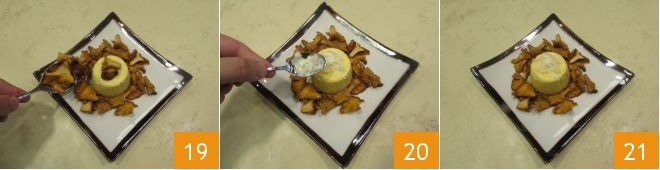Luego decora cada flan con las setas rebozuelos 19 y con virutas de Grana 20. ¡Vuestros flanes de Grana con setas rebozuelos están listos para ser disfrutados 21!
