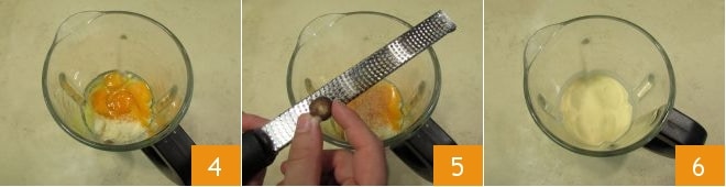 luego los huevos 4 y aromatiza con la nuez moscada 5. Ajusta de sal y bate todo hasta obtener una mezcla cremosa y homogénea 6.