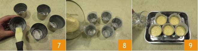 Toma los moldes de 7 cm de diámetro y 6,5 de altura, úntalos con aceite 7 y fórralos con tiras de papel de horno bastante anchas, de modo que los bordes sobresalgan de los moldes 8: de esta forma podrás despegar con mayor facilidad los flanes de los bordes una vez cocidos. Vierte dentro la mezcla, dejando aproximadamente 1 cm del borde, luego colócalos en una bandeja de bordes altos y vierte agua (a temperatura ambiente) en la bandeja, de modo que cubra los moldes por unos centímetros 9. Cocina los flanes en un horno ventilado precalentado a 160° durante 45 minutos (o estático a 180° durante 50-55 minutos).