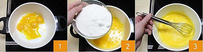 Para realizar el flan parisino, comienza por preparar la crema para el relleno: coloca en una cacerola las 5 yemas 1 y añade el azúcar granulada 2. Haz derretir bien el azúcar a fuego muy bajo, mezclando con un batidor 3.